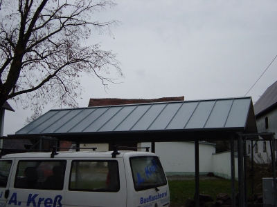 Bei dieser Arbeit handelt es sich um eine Blech-Bedachung in Titanzink, vorbewittert, Blau-Grau für ein Buswartehaus in Seukendorf