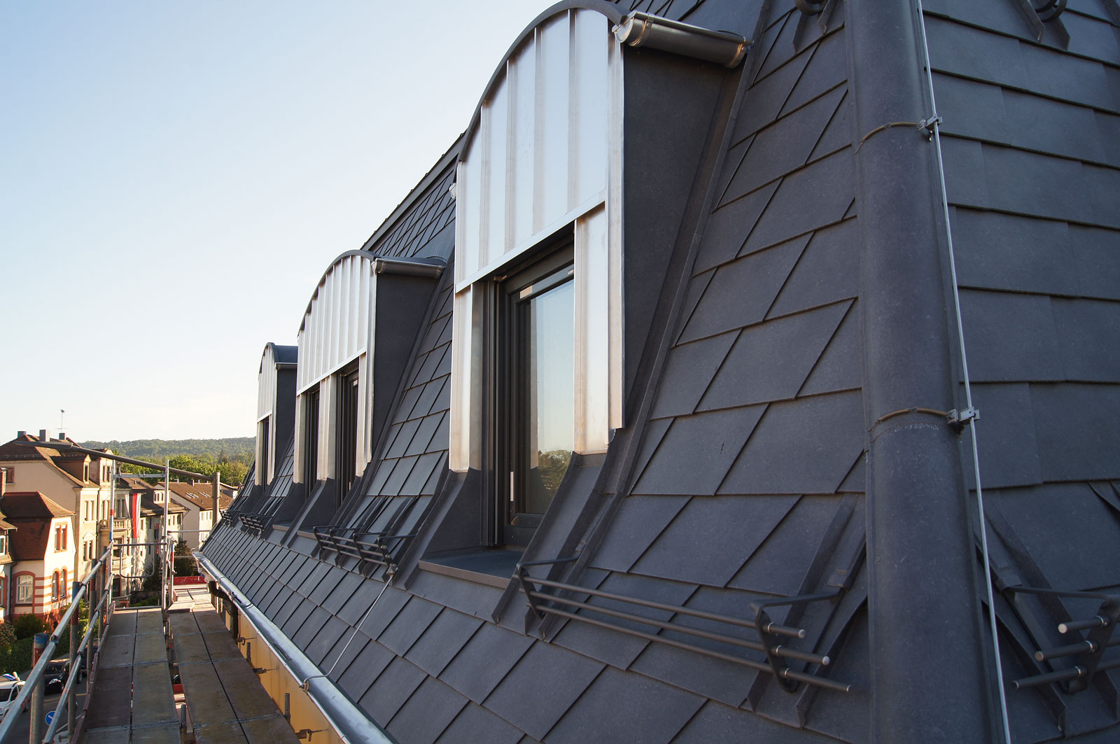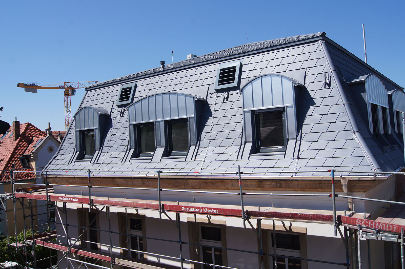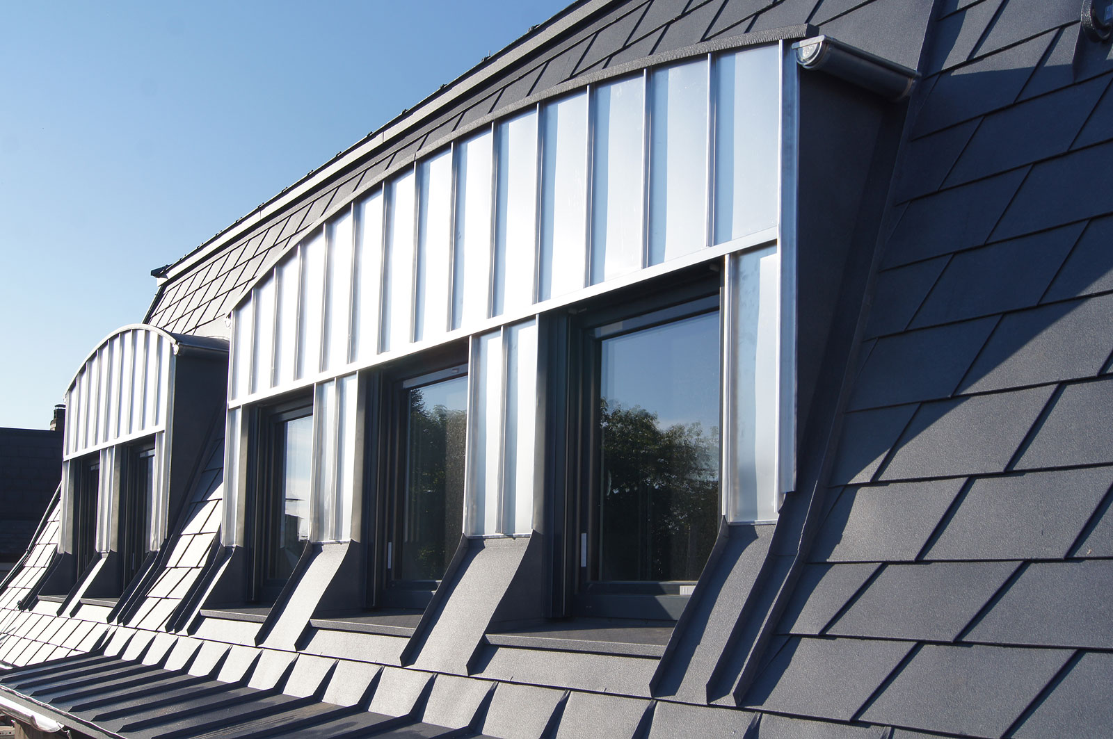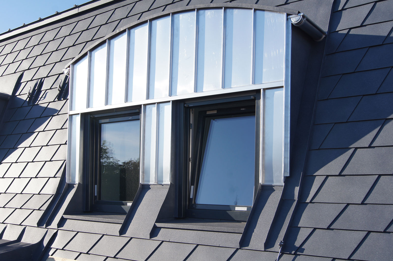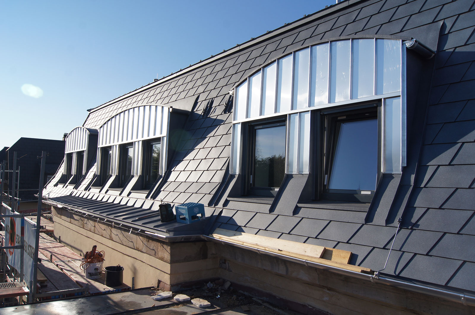 Bei diesem Bauvorhaben wurde das Mansardendach einschließlich sämtlicher Dachaufbauten mit Aluminiumblechen eingedeckt bzw. bekleidet.