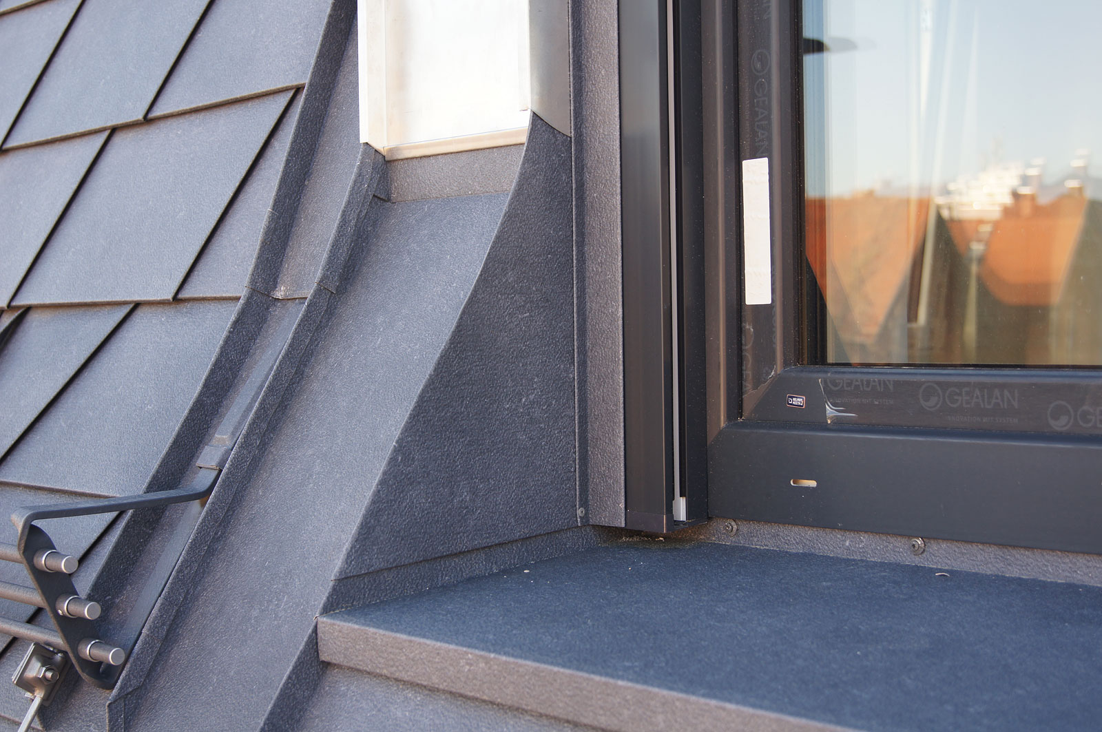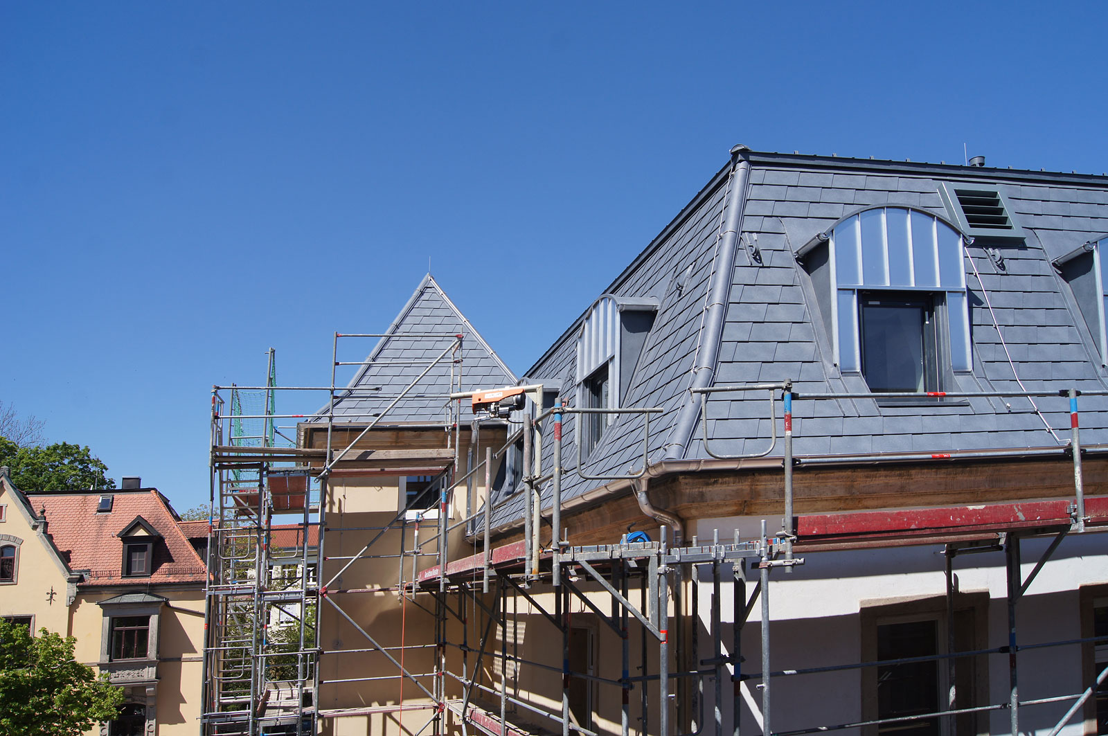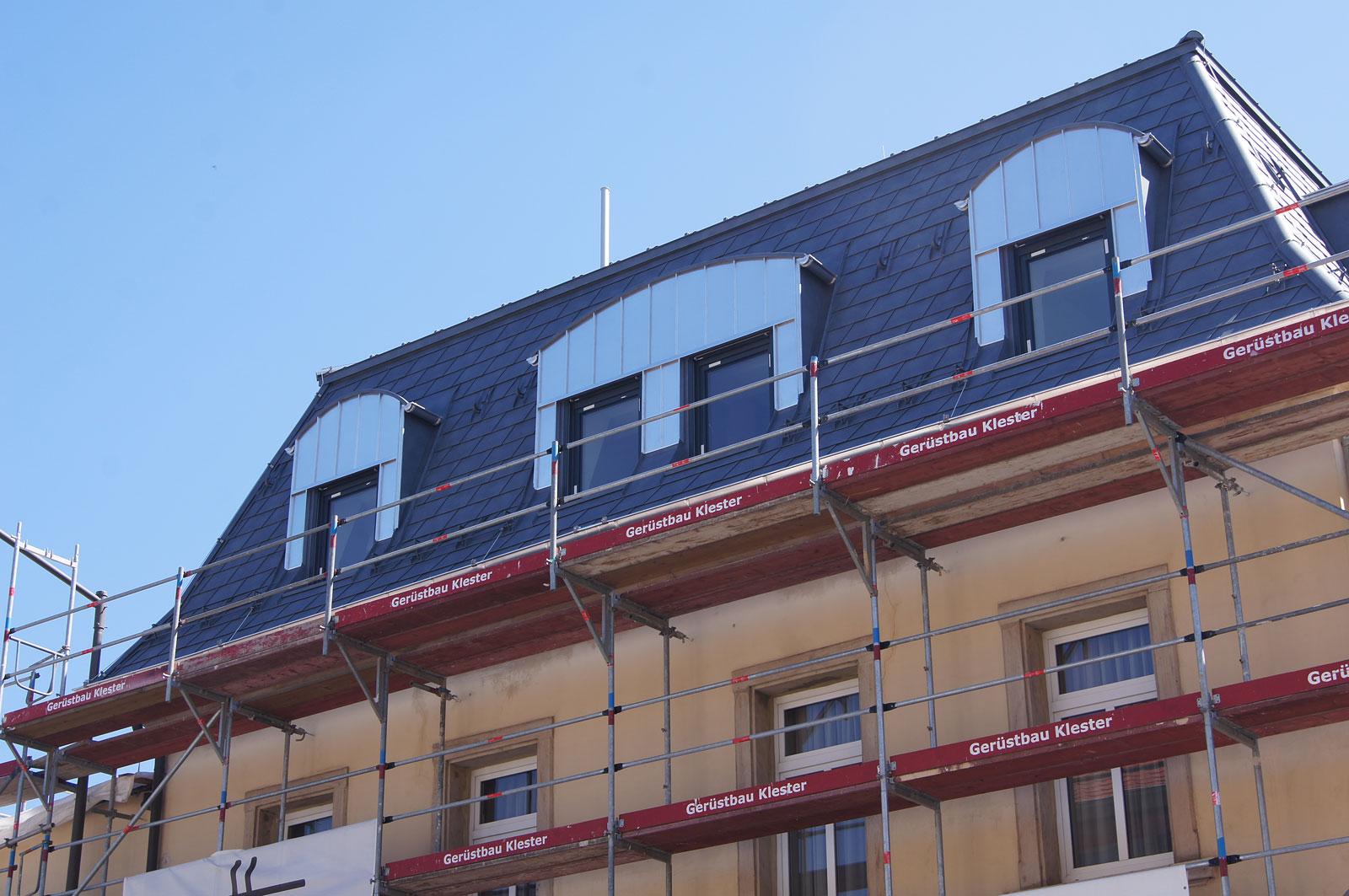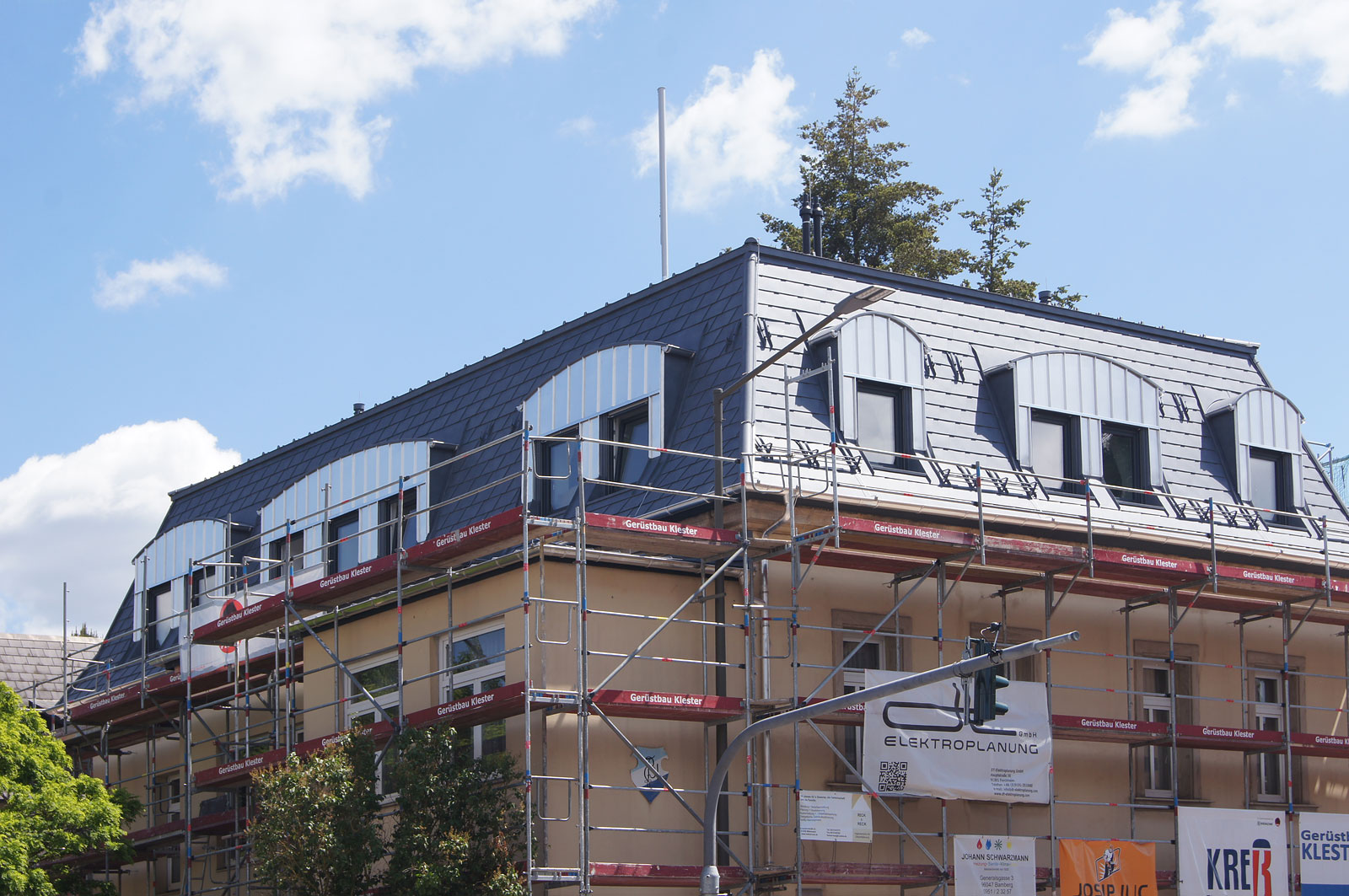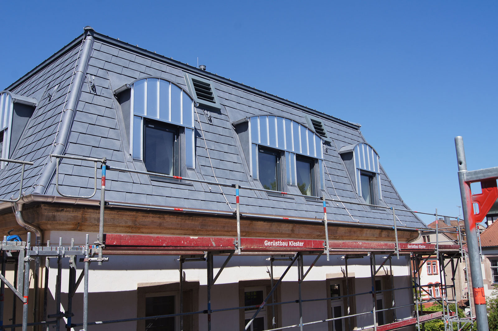 Bei diesem Bauvorhaben wurde das Mansardendach einschließlich sämtlicher Dachaufbauten mit Aluminiumblechen eingedeckt bzw. bekleidet.