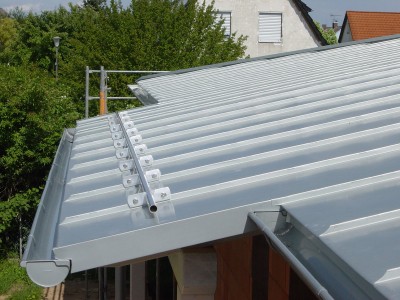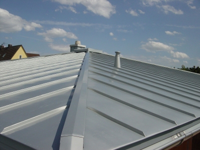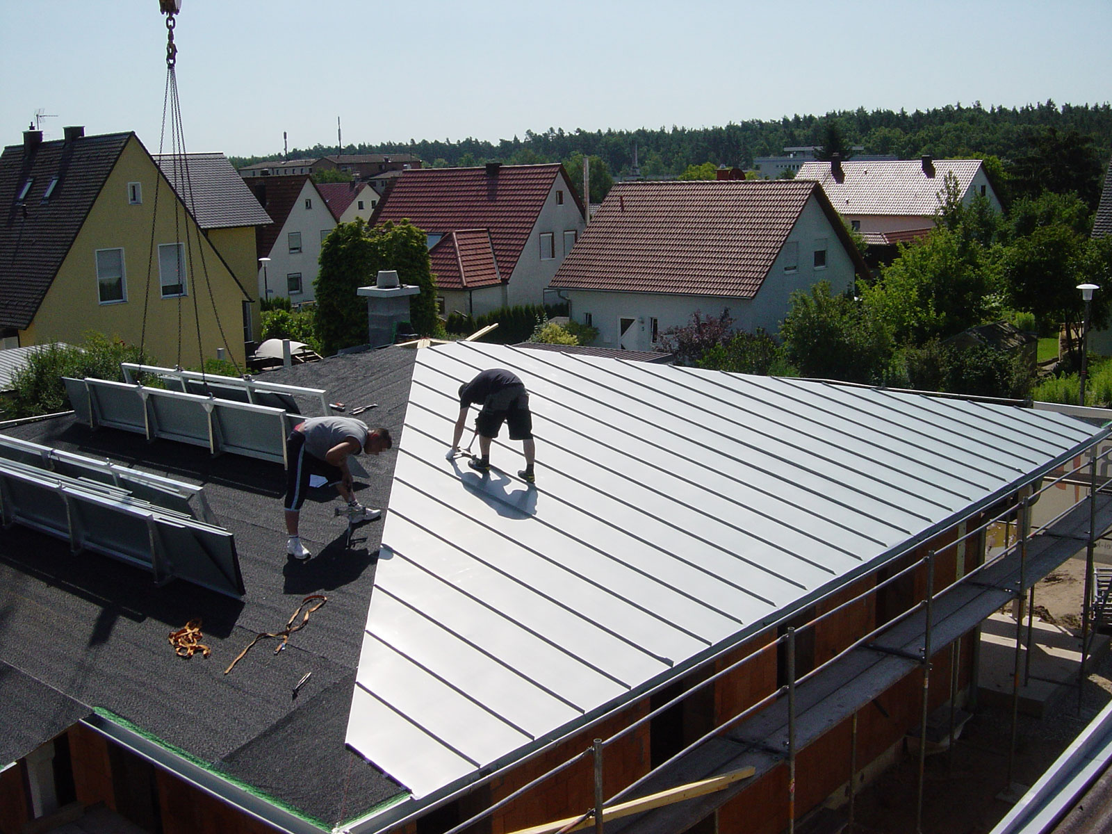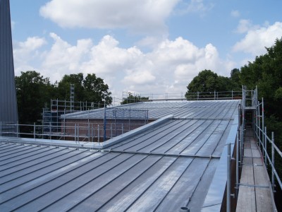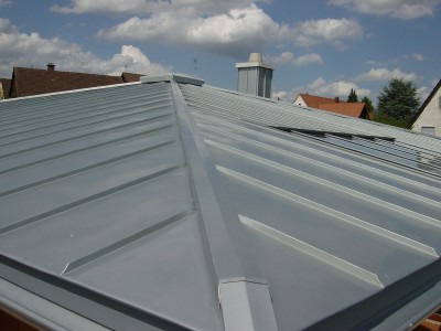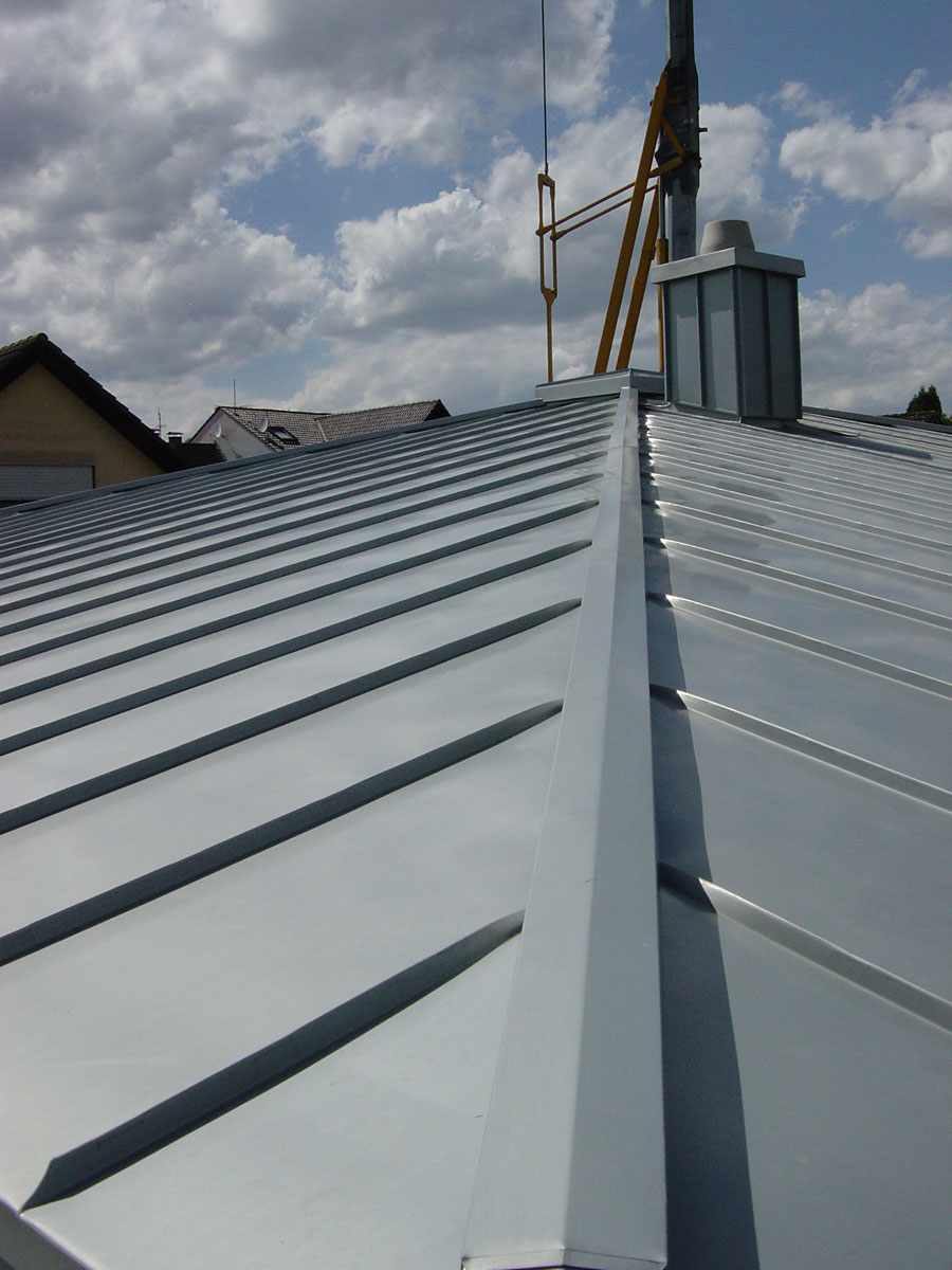 Bei diesem Objekt handelt es sich um eine Metalldacheindeckung in Winkelstehfalzausführung mit dem Material Titanzink (Fabrikat RHEINZINK) 0,7 mm, vorbewittert, Blaugrau.